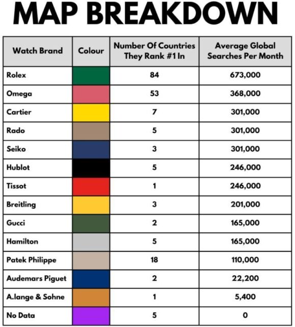 Wenn wir die Daten nach Prozent aufschlüsseln, stellen wir fest, dass Rolex in fast der Hälfte der Länder der Welt die erste Wahl ist. Omega ist die zweitbeliebteste Marke, aber dennoch weitaus weniger gesucht als Rolex.