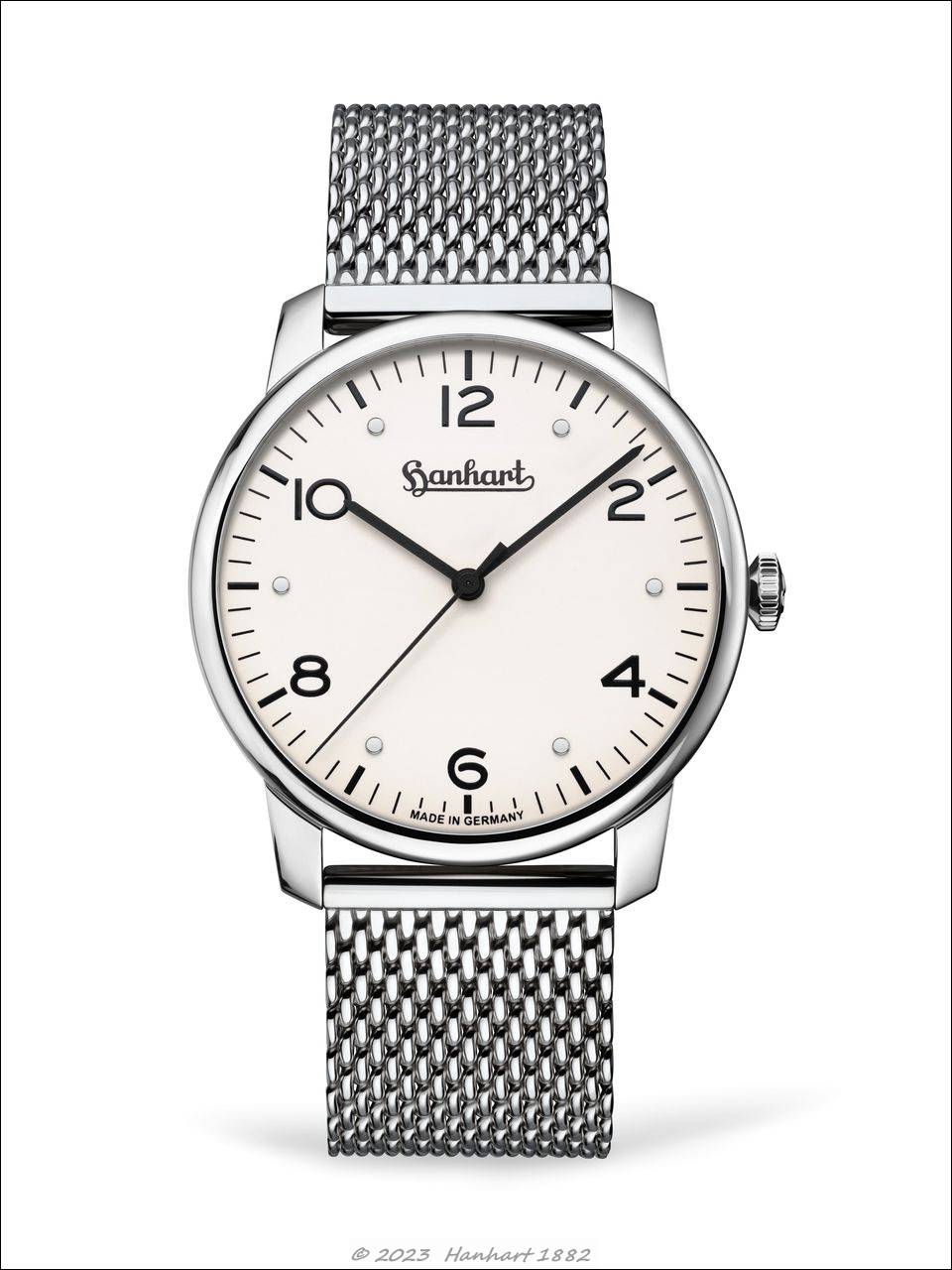 Die Uhr selbst ist mit 38,5 mm Durchmesser und 10 mm Gehäusehöhe auf das Wesentliche reduziert, schnörkellos und flach. Die Krone trägt das „h“ des historischen Hanhart Logos und das konvexe, innen entspiegelte Saphirglas schützt perfekt vor Kratzern. Die Uhr ist wasserdicht bis zu 5 bar / 5 ATM.