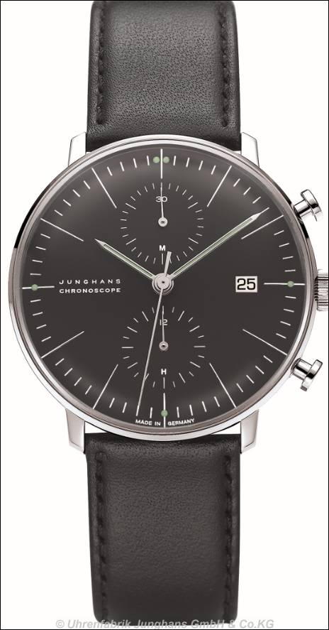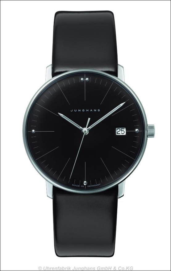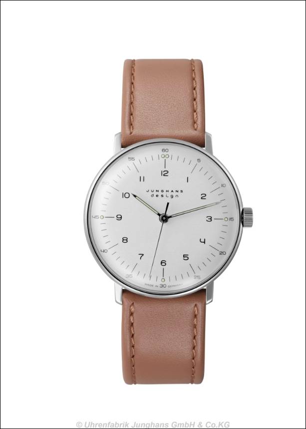 Die klare und logische Gestaltung der max bill Handaufzug basiert auf den Originaldesignzeichnungen von Max Bill. Leuchtpunkte bei 3, 6 und 9 Uhr sowie ein Doppelpunkt bei 12 Uhr und die mit Leuchtmasse aus-gelegten Zeiger ermöglichen auch bei Dunkelheit gute Ablesbarkeit. Max Bills konsequente Gestaltung zeigt sich auch im Junghans-Schriftzug auf dem Zifferblatt: Die Schrifttype der Buchstaben ist identisch mit jener der Ziffern.