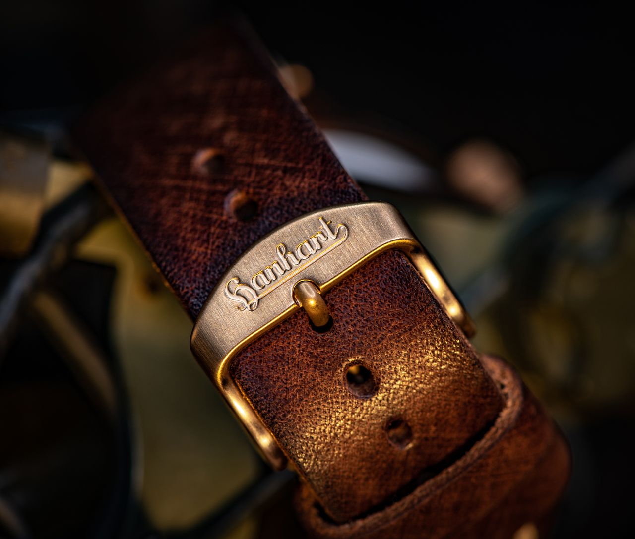 Die große Krone ist mit dem „h“ des historischen Hanhart Logos versehen. Die Ziffern und Zeiger der PIONEER One Bronze sind zur perfekten Ablesbarkeit bei Tag und Nacht mit Super LumiNova® Leuchtmasse C3 green line belegt.